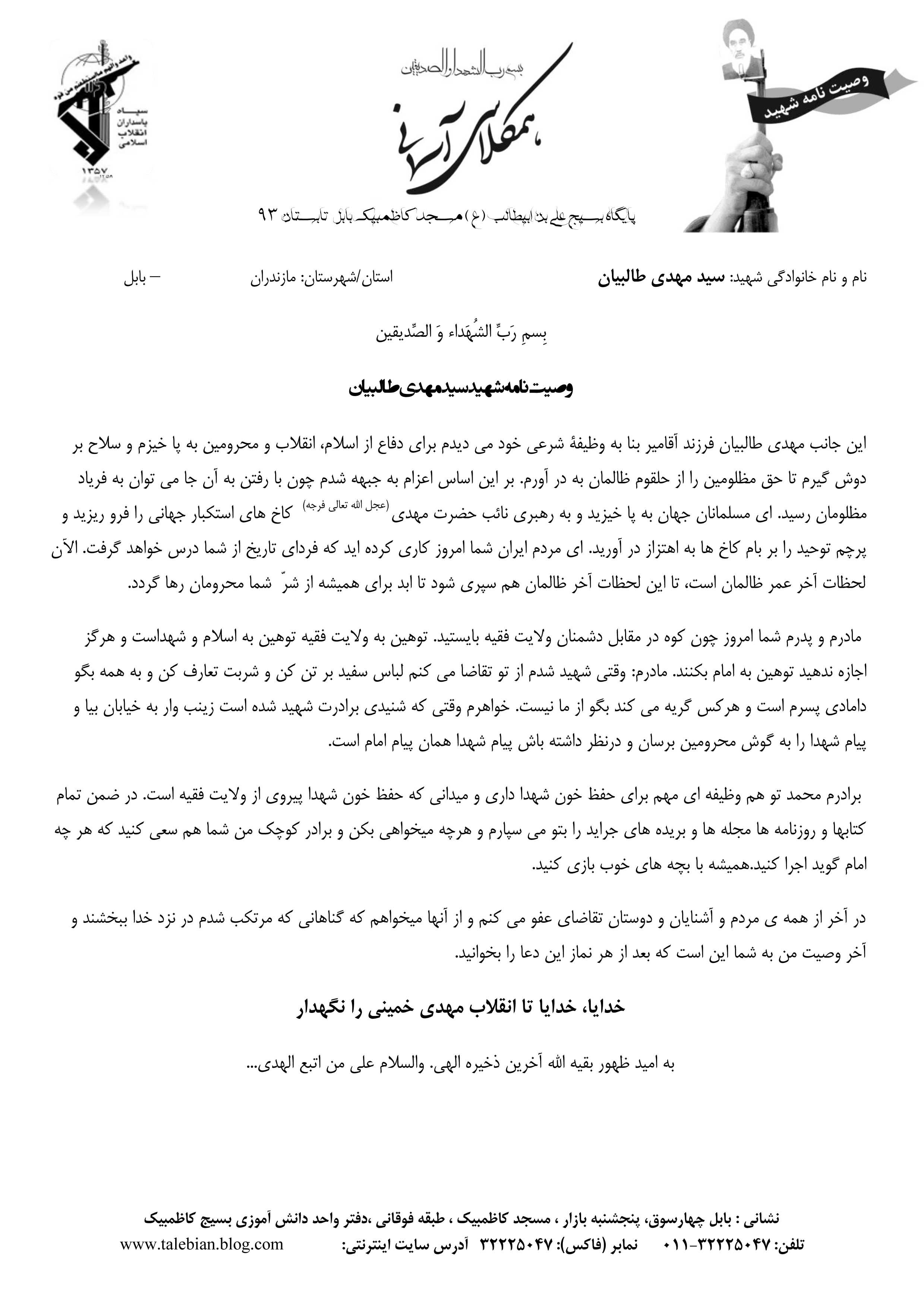 سرگذشت پژوهی شهید سید مهدی طالبیان - تابستان ۹۳ - پایگاه بسیج علی بن ابیطالب ع مسجد کاظمبیک بابل - شادی روح شهید صلوات -